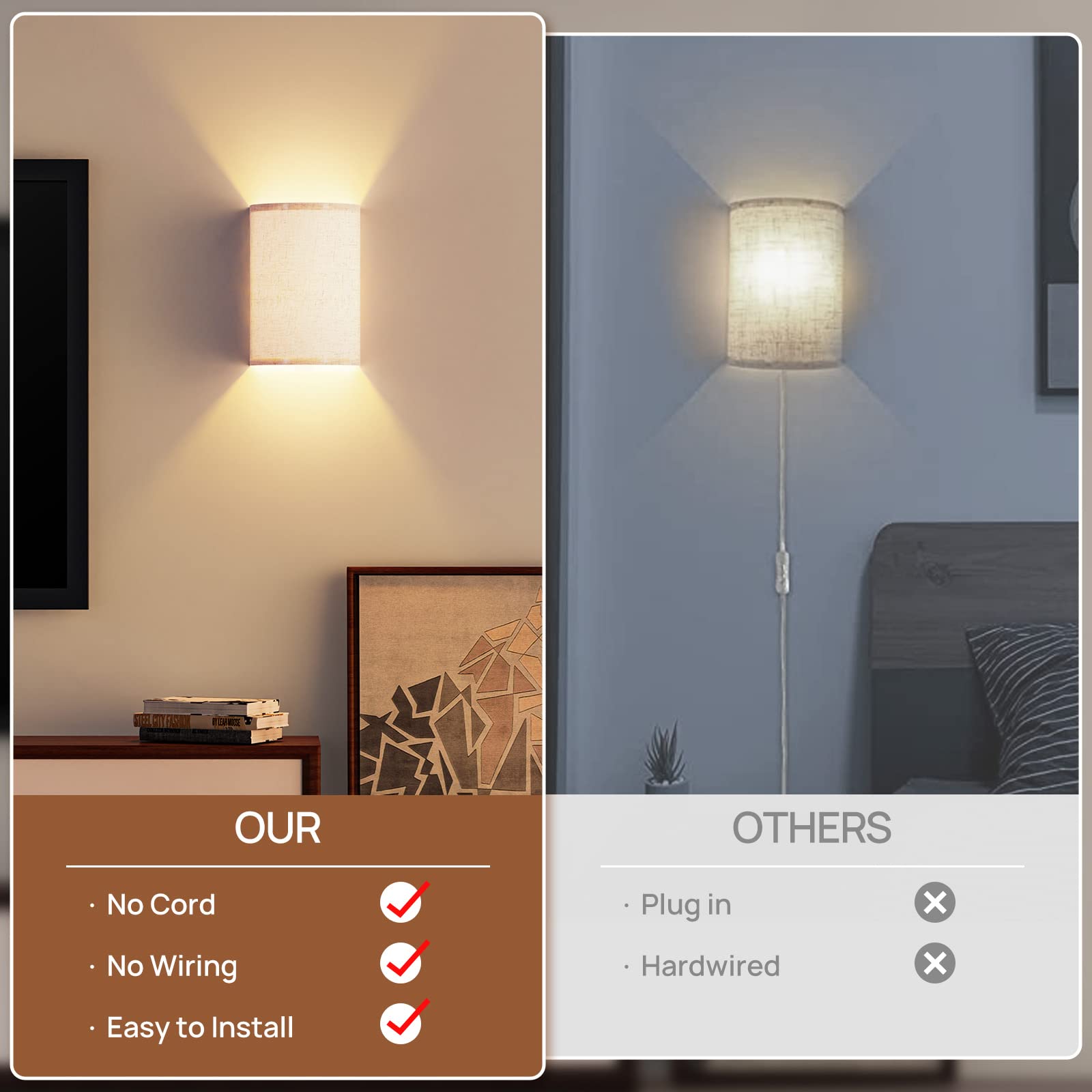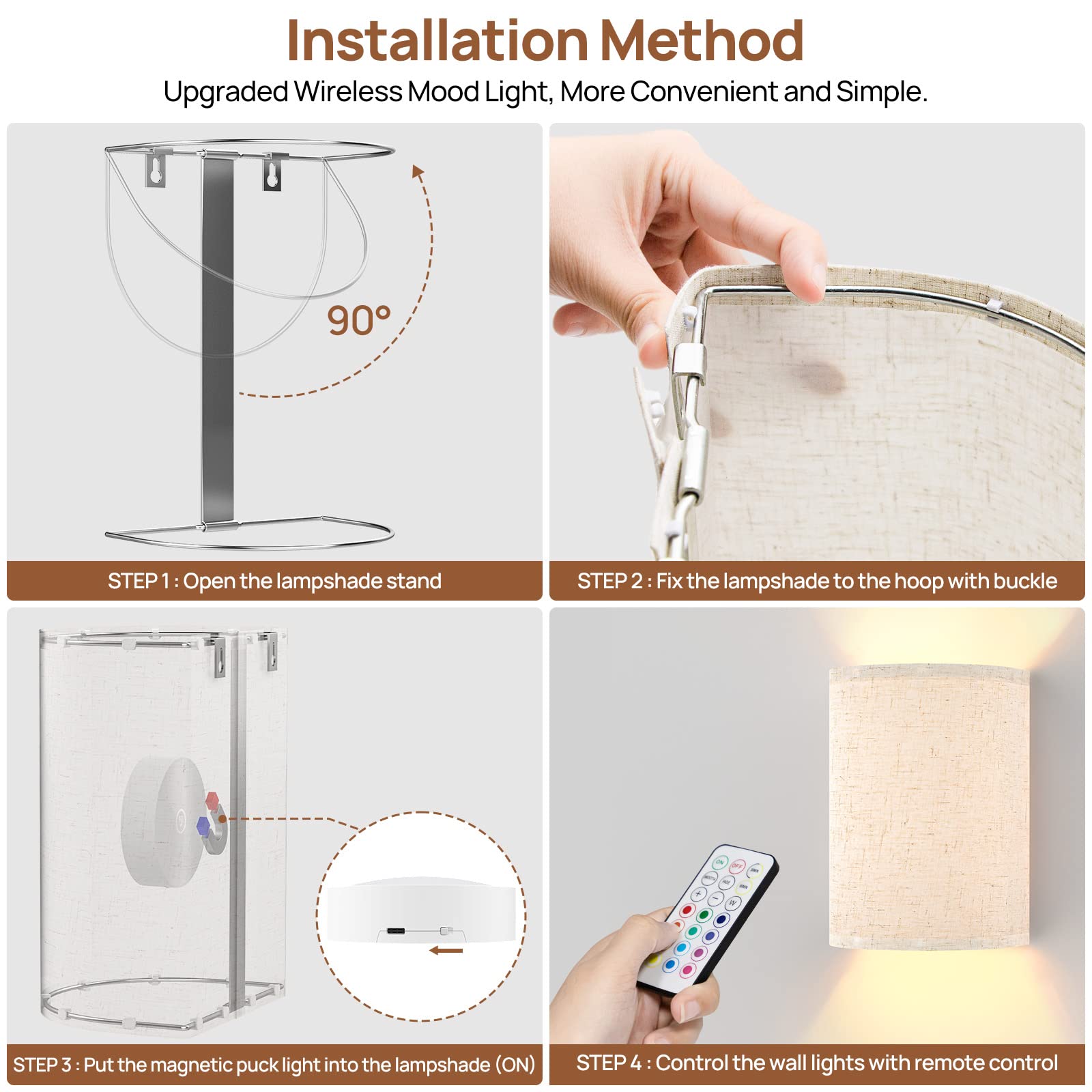 - [Magnetic Connection & Easy to Install] Our modern universal battery-operated wall sconces were no hard wires and no cords. A truly wireless wall sconce with magnetic puck lights, which are vertically magnet on the mounting plate, so that the lampshade has no shadow and the light is more uniform. Easy to take it off, and charge it at any time.